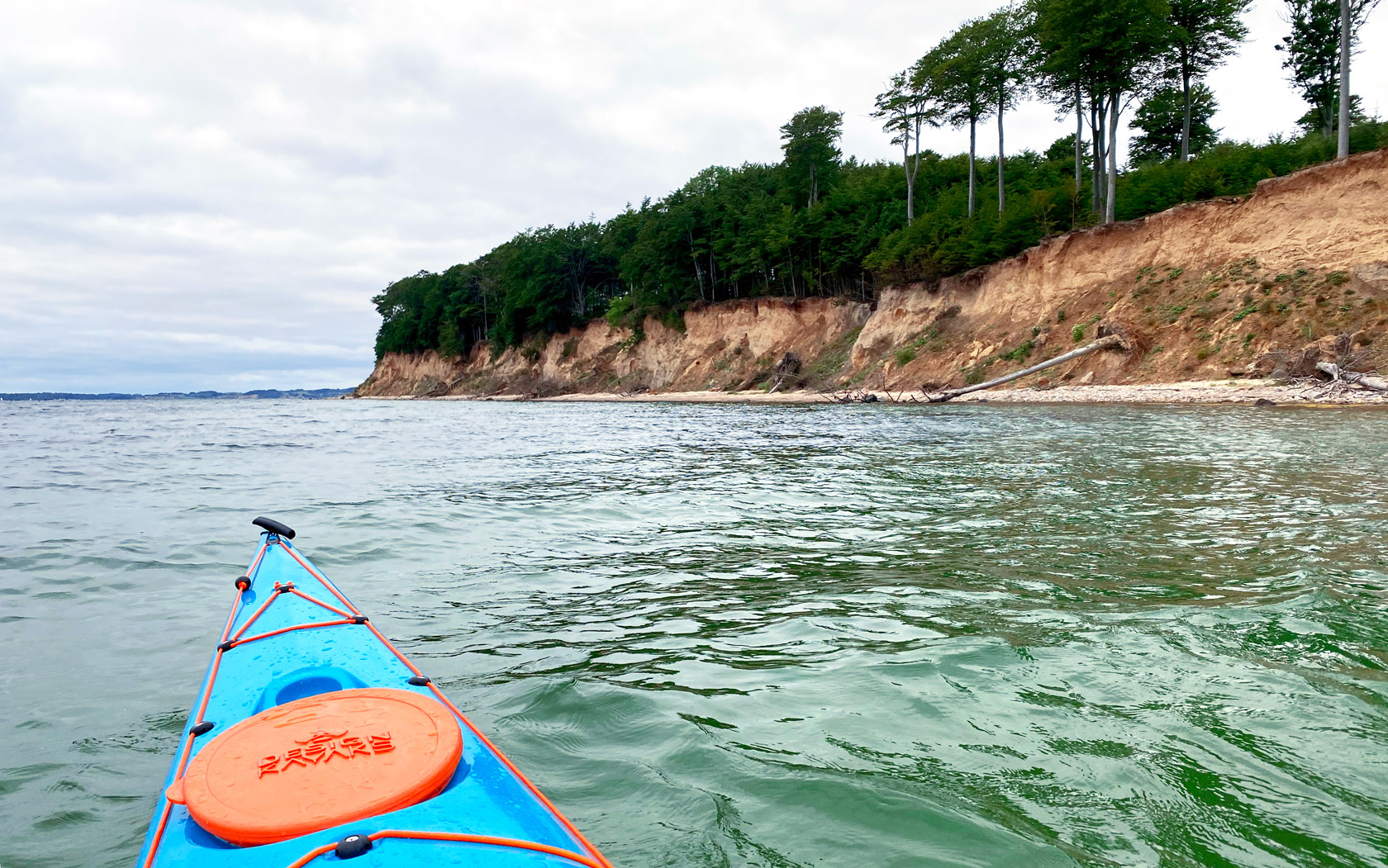 Continue paddling northeast along Kegnæs towards Torsthoved. The flat coastal meadows here contrast beautifully with the steep cliffs of Sønderskoven on the opposite side and are home to a diverse fauna as well as grazing cattle.